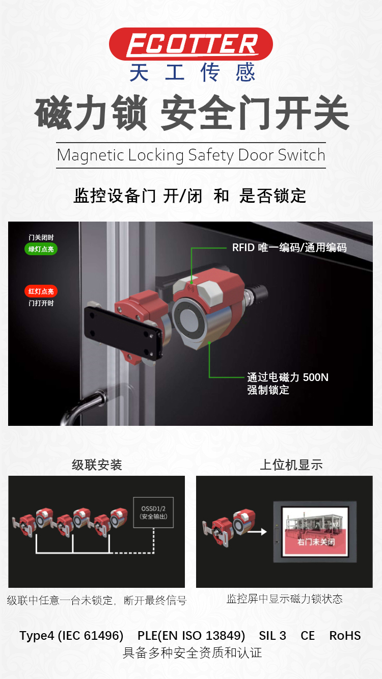 ML-500系列具有Type4 (IEC 61496)、PLE(EN ISO 13849)、SIL 3、CE、RoHS等多種安全資質(zhì)和認(rèn)證,使用更放心。其鎖定力可達(dá)500N,具有抗干擾、防塵防水、耐腐蝕、高負(fù)載,適用于高安全性和惡劣工況需求。
